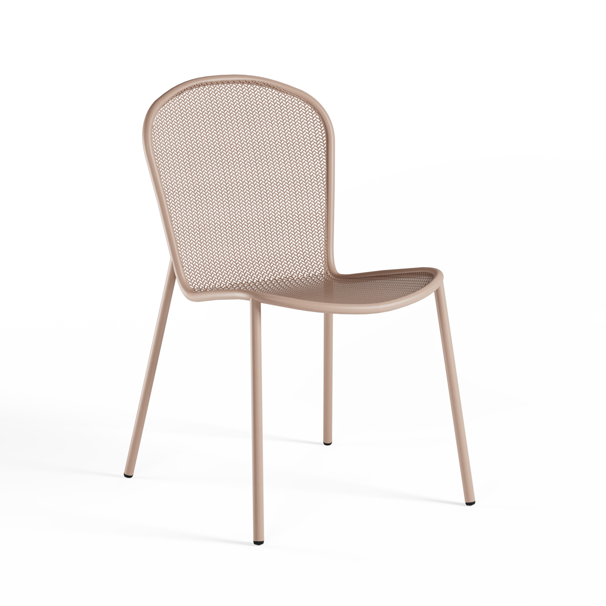 De structuur is vervaardigd uit buisvormig ijzer, terwijl de zitting en rugleuning zijn uitgevoerd in thermisch verzinkt strekmetaal. Het metaal krijgt een zachte, comfortabele uitstraling door de organische vorm die de rondingen van het lichaam volgt en door het verfijnde patroon dat doet denken aan textiel of kant. Dankzij het subtiele samenspel van parallelle buizen en vloeiende lijnen ontstaat een luchtig en tegelijkertijd omhullend design.